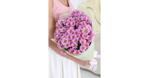 Хризантема кустовая Сантини, розовая-25 шт., упаковка-авторская, тишью-белая , лента-широкая атласная.