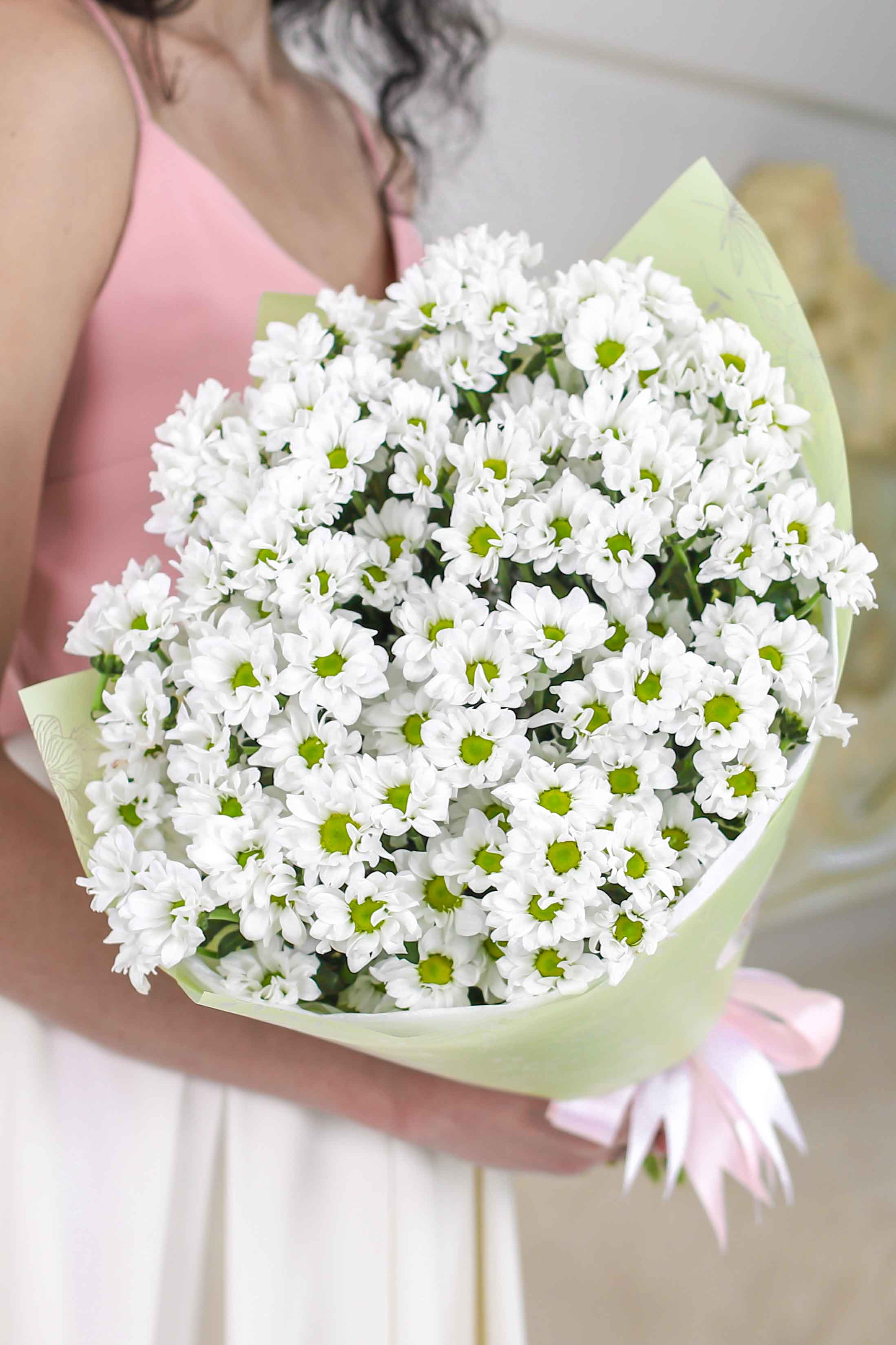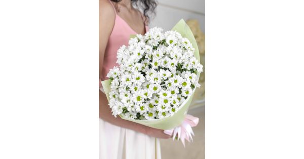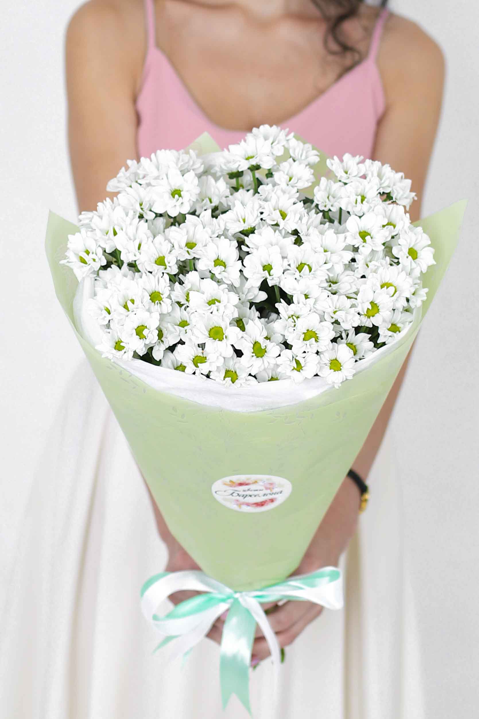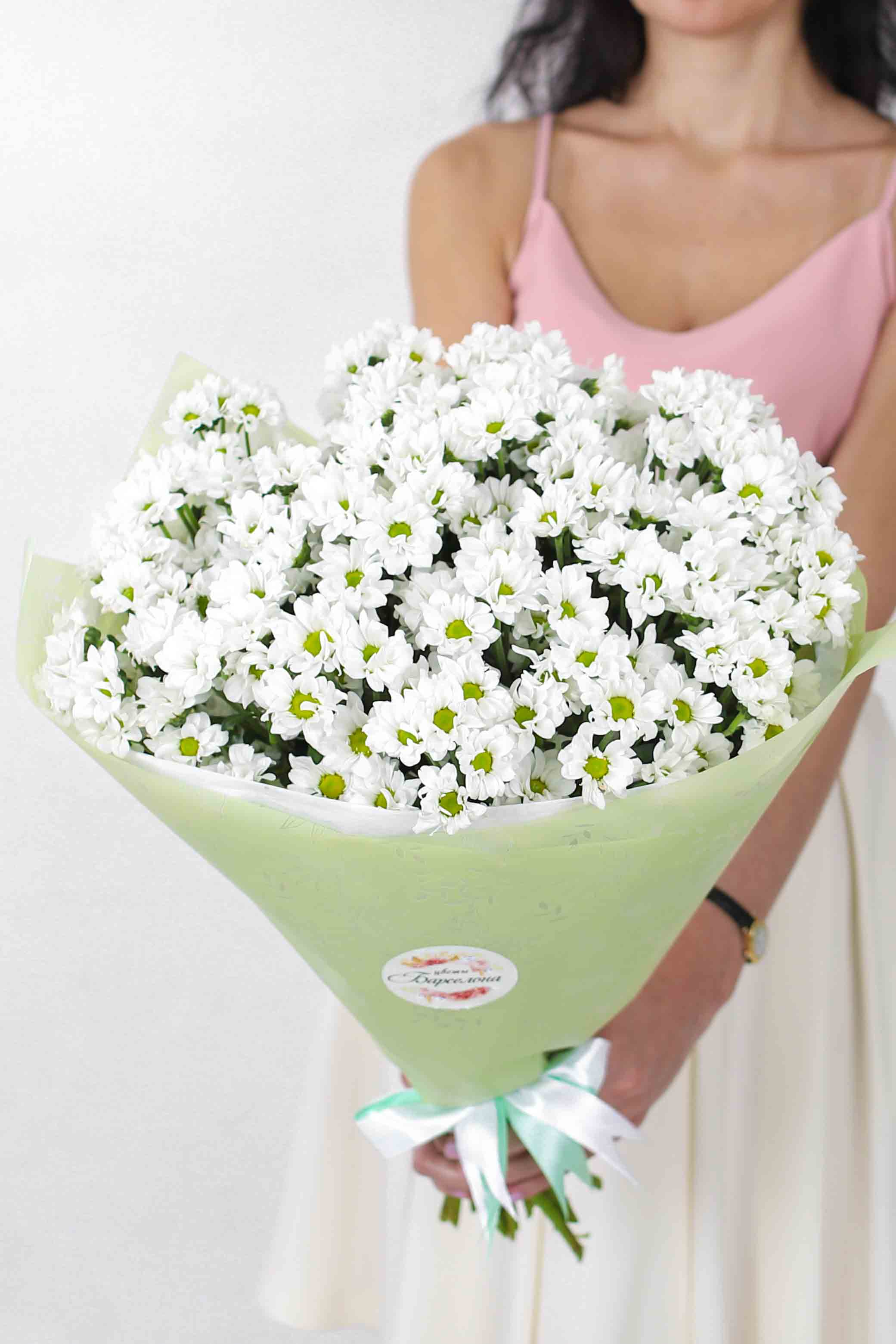 Хризантема кустовая Сантини, белая-25 шт., упаковка-авторская, тишью-белая , лента-широкая атласная.
