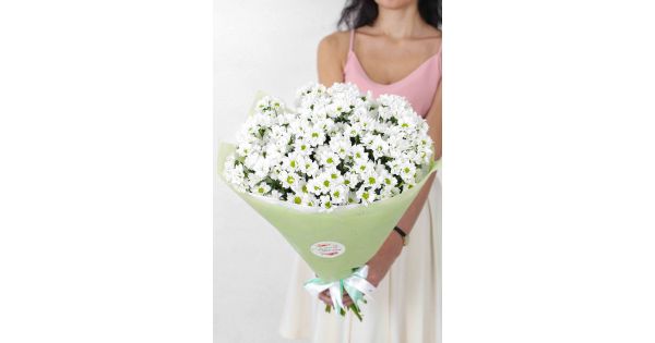 Состав-49 хризантем ромашек микс, Высота-55 см., Упаковка-авторская, Подложка-тишью, Лента-широкая атласная.