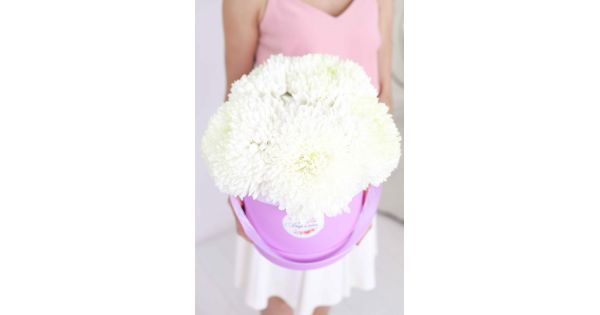 Ромашка кустовая (матрикария)-6 шт., Хризантема Сантини микс-15 шт., коробка (18 х 24 см.), подложка-тишью белая, атласная лента.