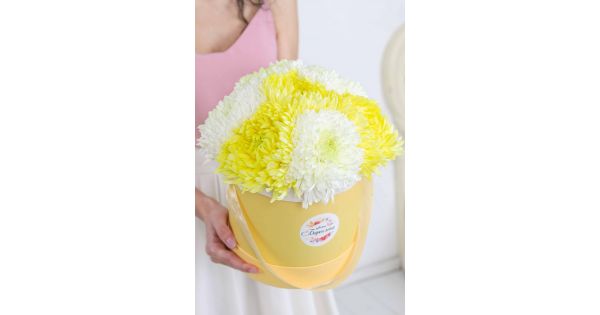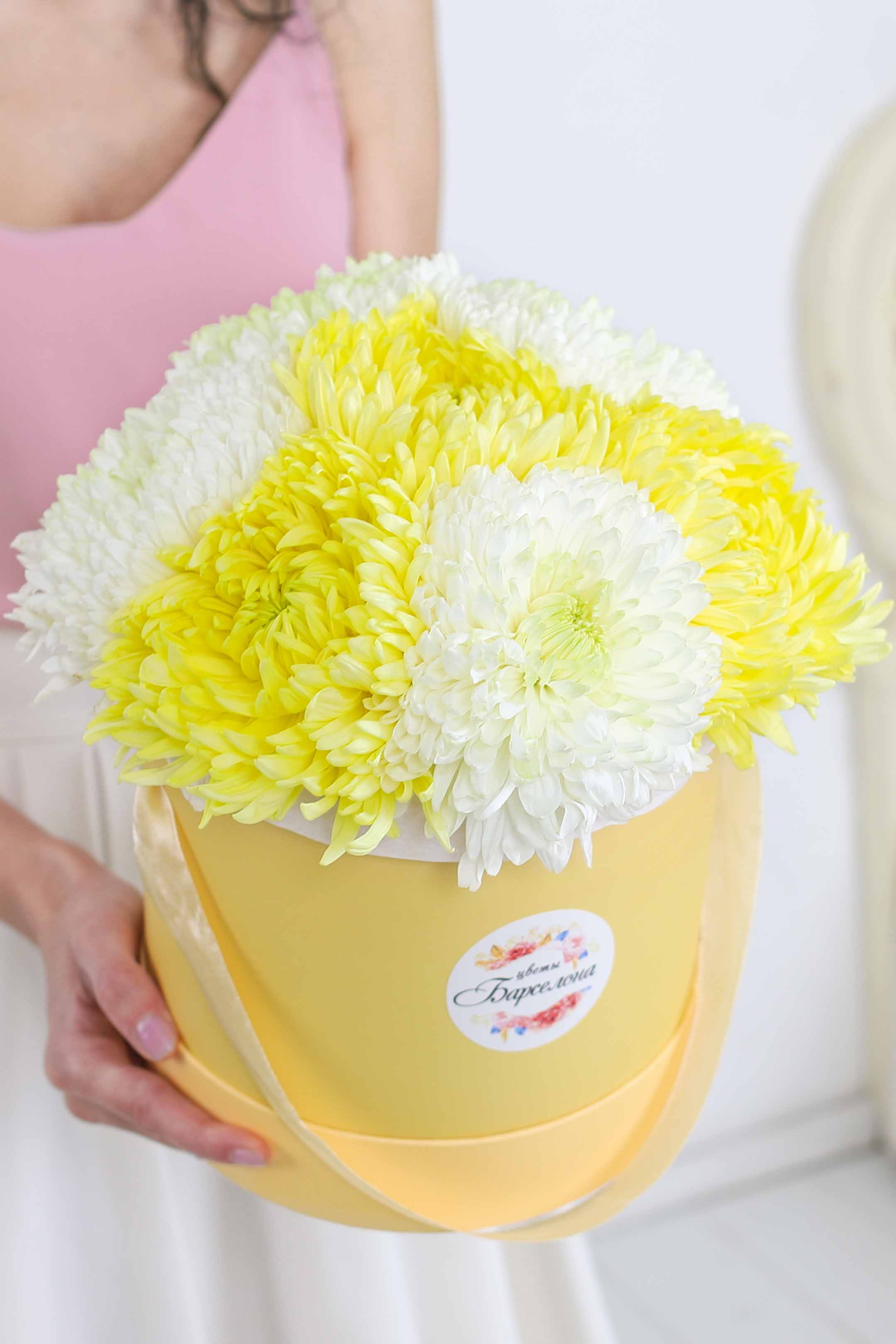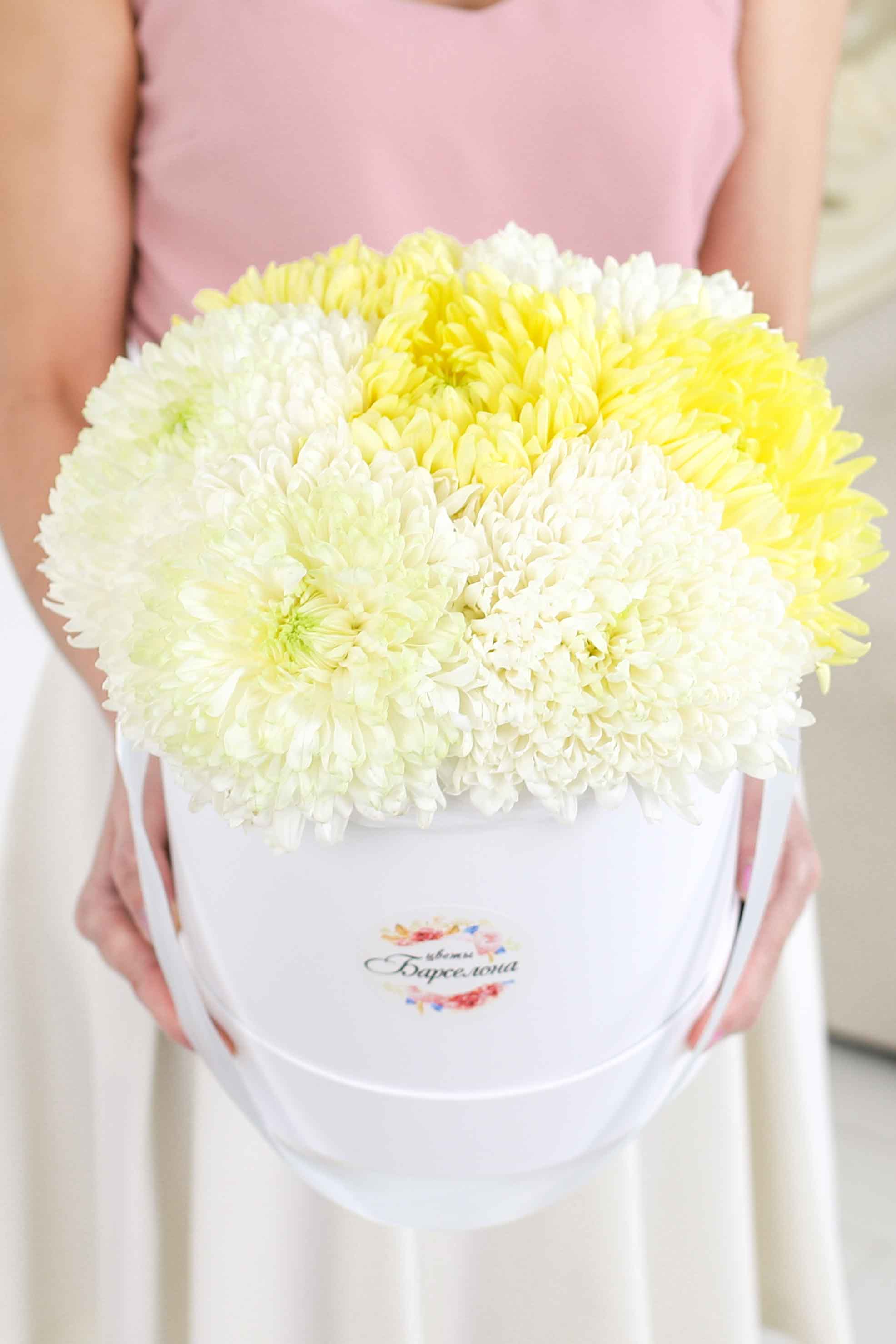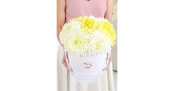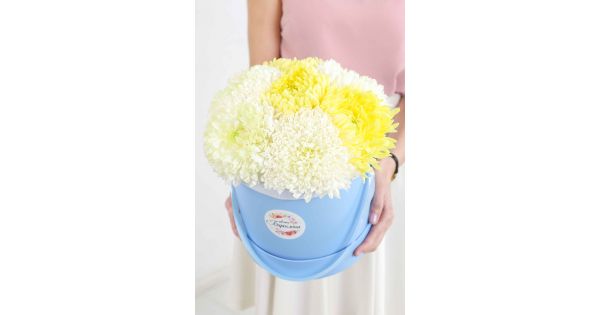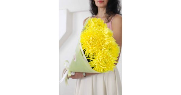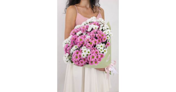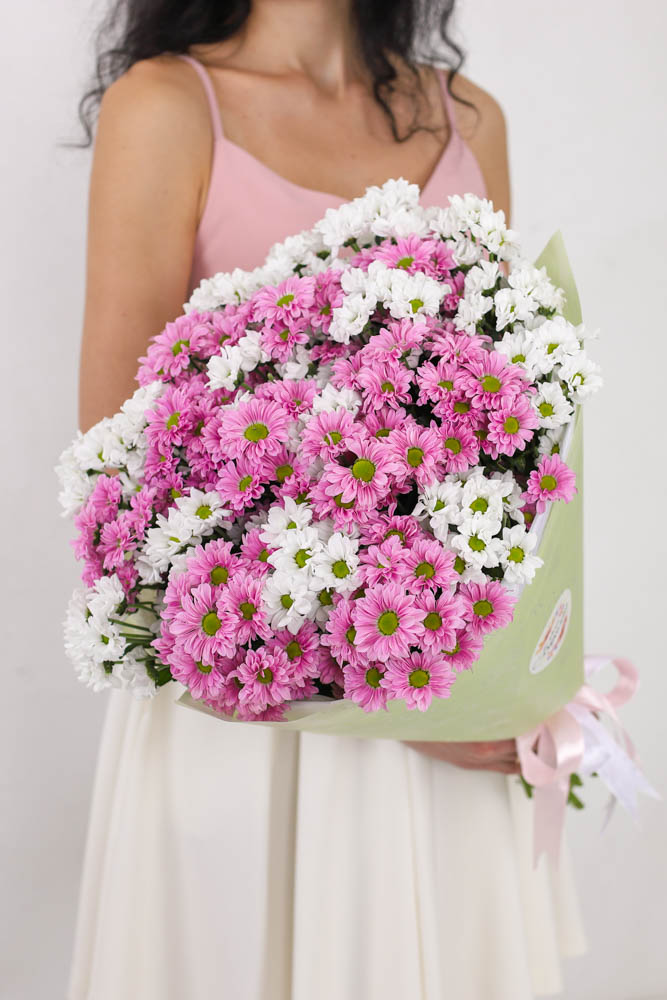 Состав-25 хризантем ромашка микс, Высота-55 см., Упаковка-авторская, Подложка-тишью, Лента-широкая атласная.