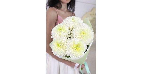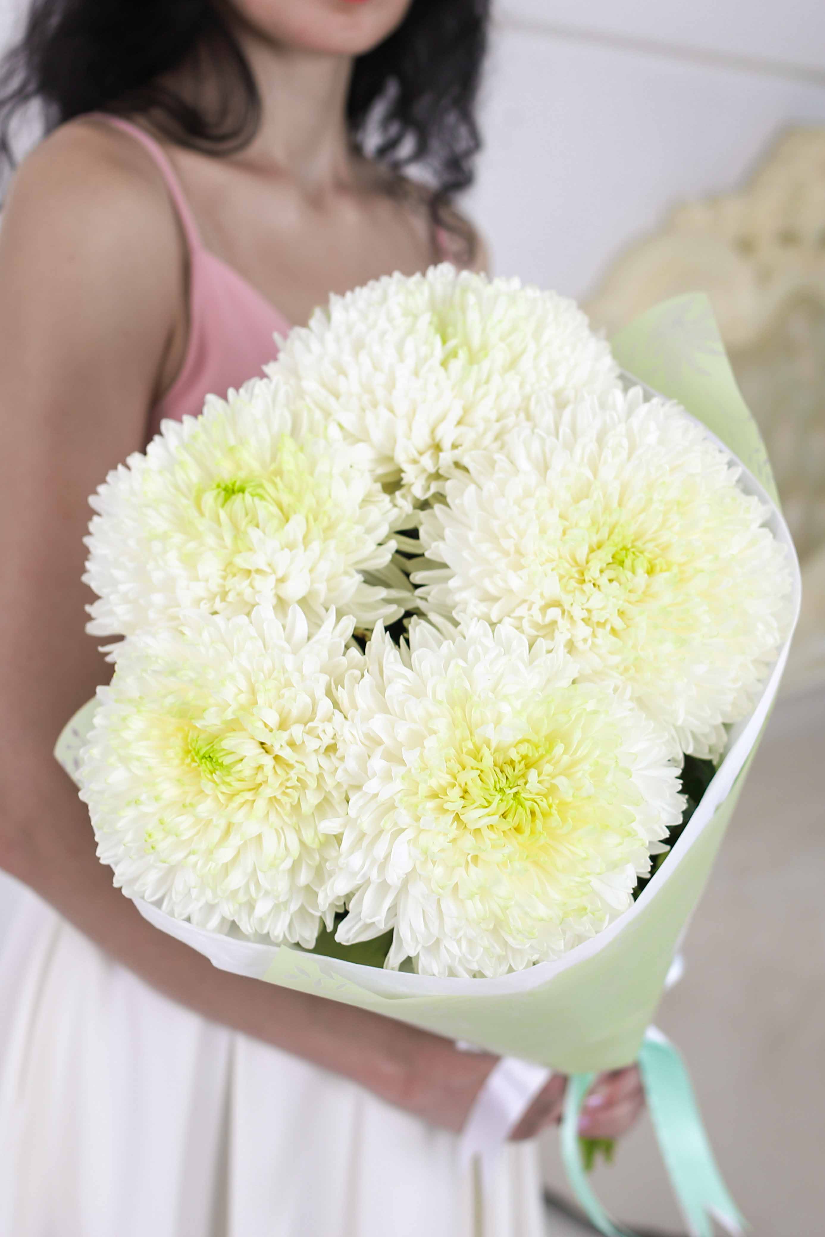 Состав-5 одноголовых хризантем Магнум, Высота-60 см., Упаковка-авторская, Подложка-тишью, Лента-широкая атласная.
