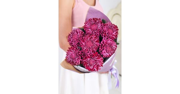 Состав-7 хризантем Бигуди-Purple, Высота-60 см., Упаковка-авторская, Подложка-тишью, Лента-широкая атласная.
