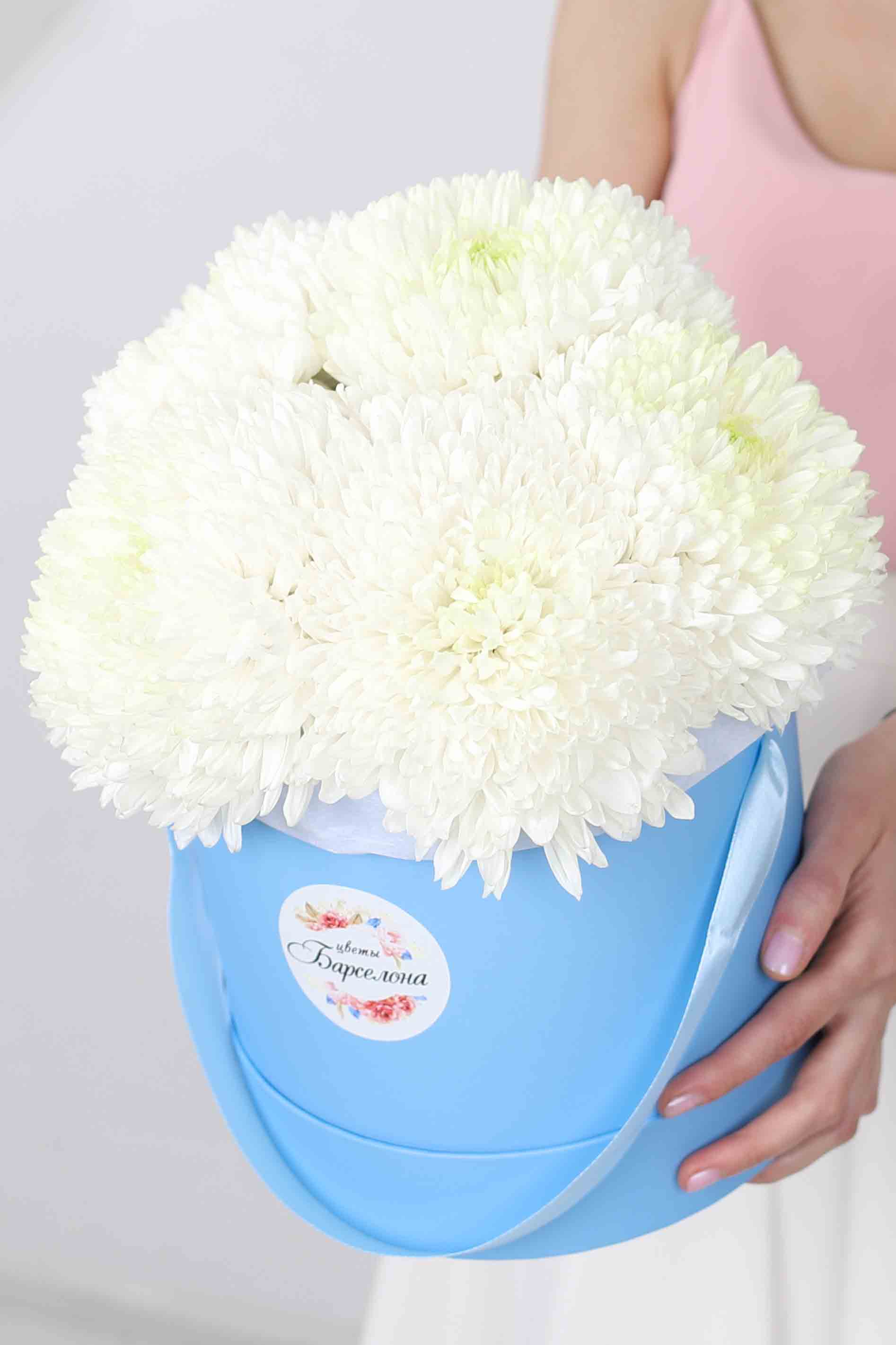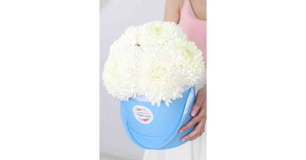 Голубая гортензия (Голландия)-1 шт., Диантус белый-4 шт. (сорт moonlight), Альстромерия белая-4 шт., Ромашка (матрикария)-5 шт., Эвкалипт (стабилизированный), упаковка-фоамиран, подложка-тишью.