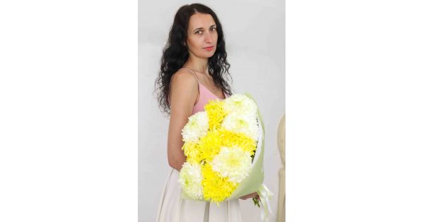 Состав-15 хризантем ромашка микс, Высота-60 см., Упаковка-авторская, Подложка-тишью, Лента-широкая атласная.