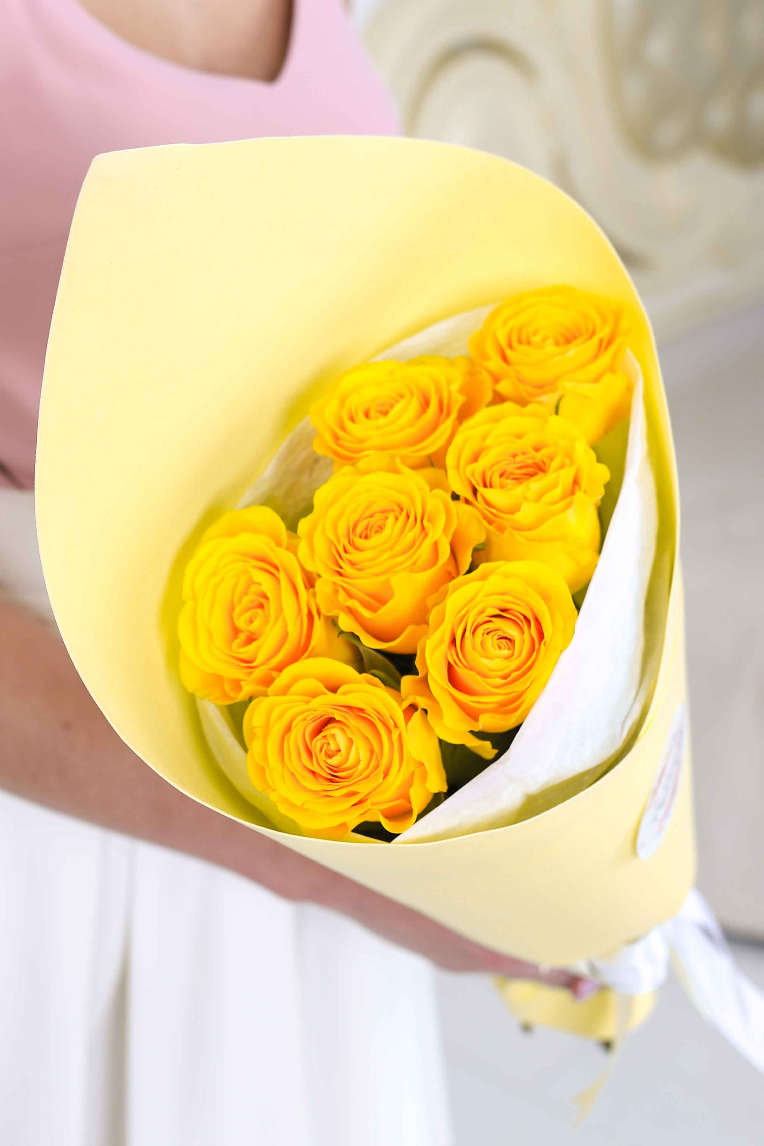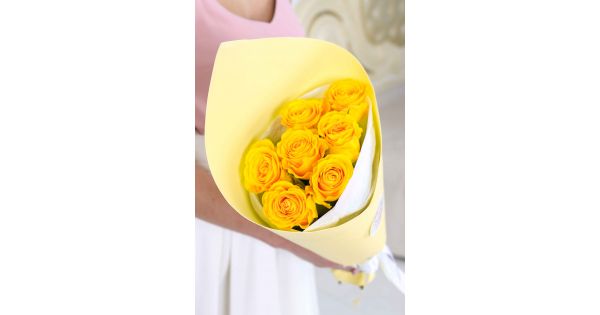Количество-7, сорт-Brighton , Высота-50 см., упаковка-фоамиран белый, тишью, лента-широкая атласная.