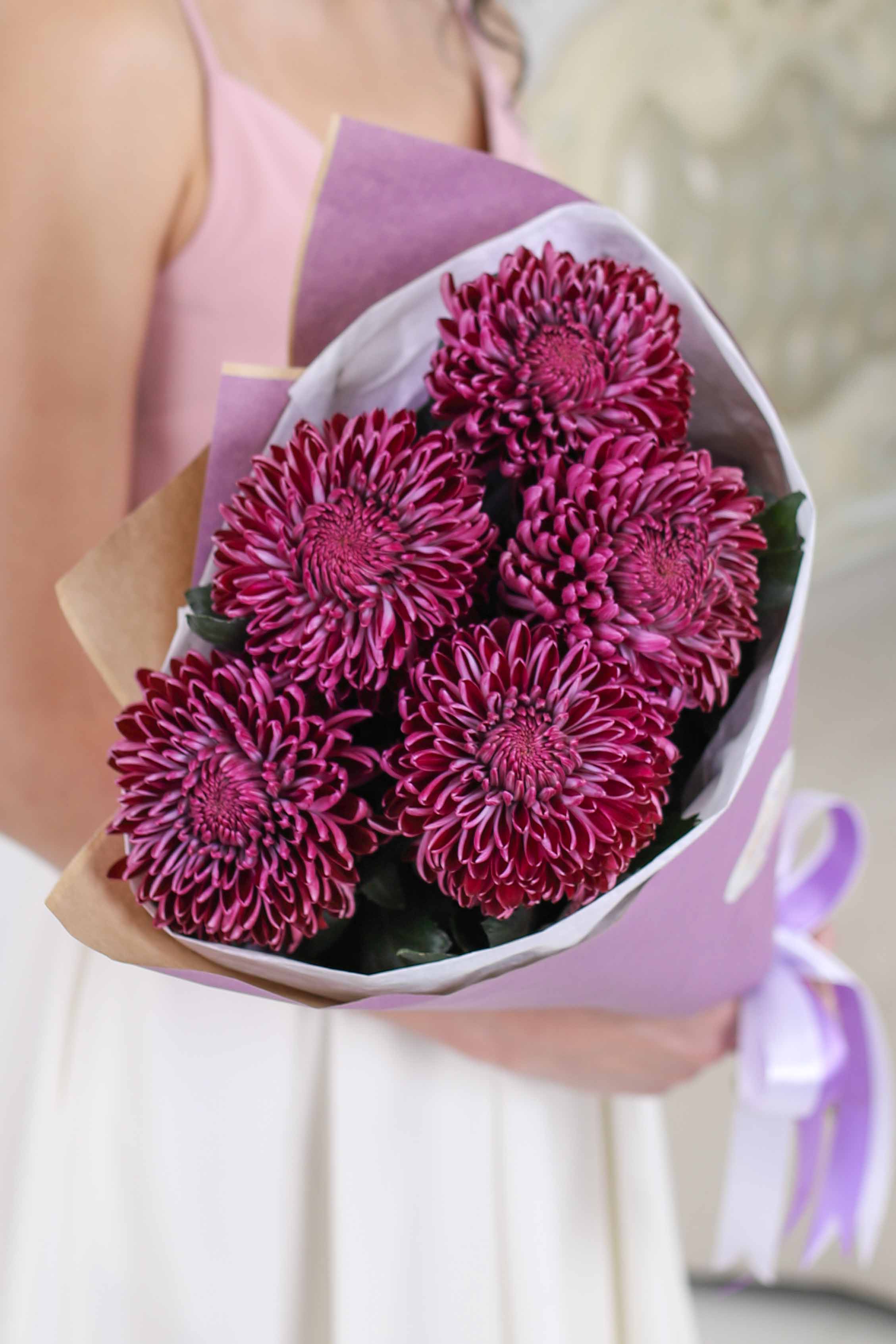 Состав-5 хризантем Бигуди-Purple, Высота-60 см., Упаковка-авторская, Подложка-тишью, Лента-широкая атласная.