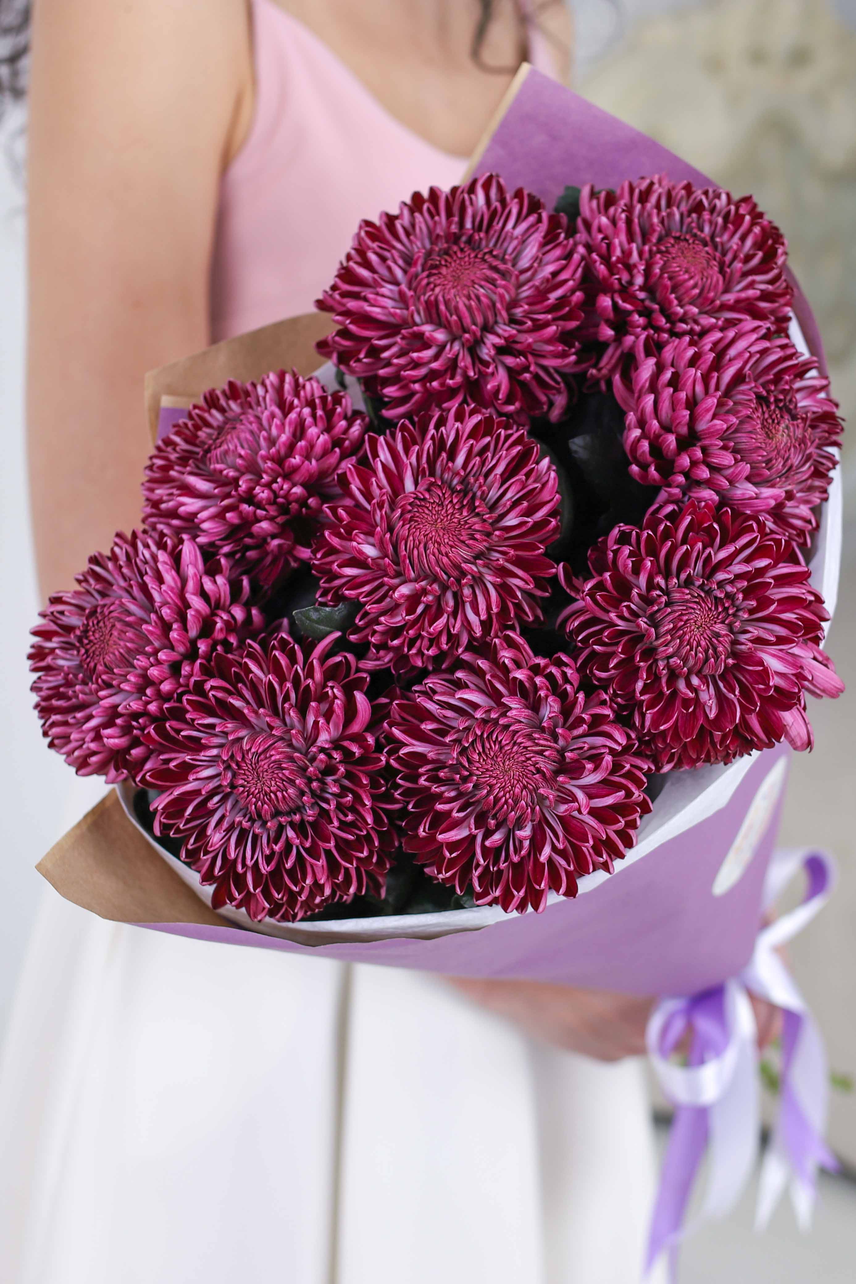 Состав-9 хризантем Бигуди-Purple, Высота-60 см., Упаковка-авторская, Подложка-тишью, Лента-широкая атласная.