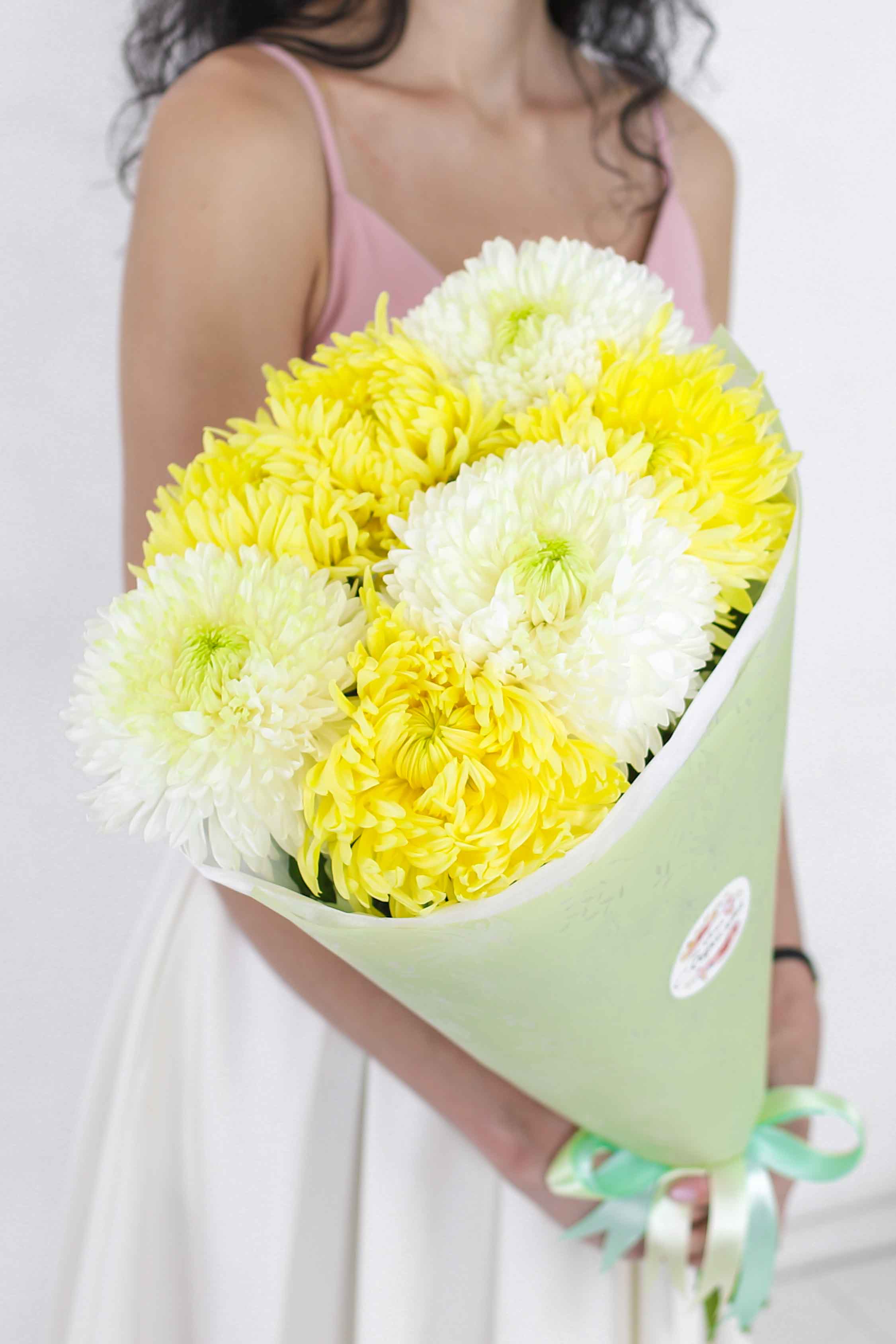Состав-15 хризантем ромашка микс, Высота-60 см., Упаковка-авторская, Подложка-тишью, Лента-широкая атласная.