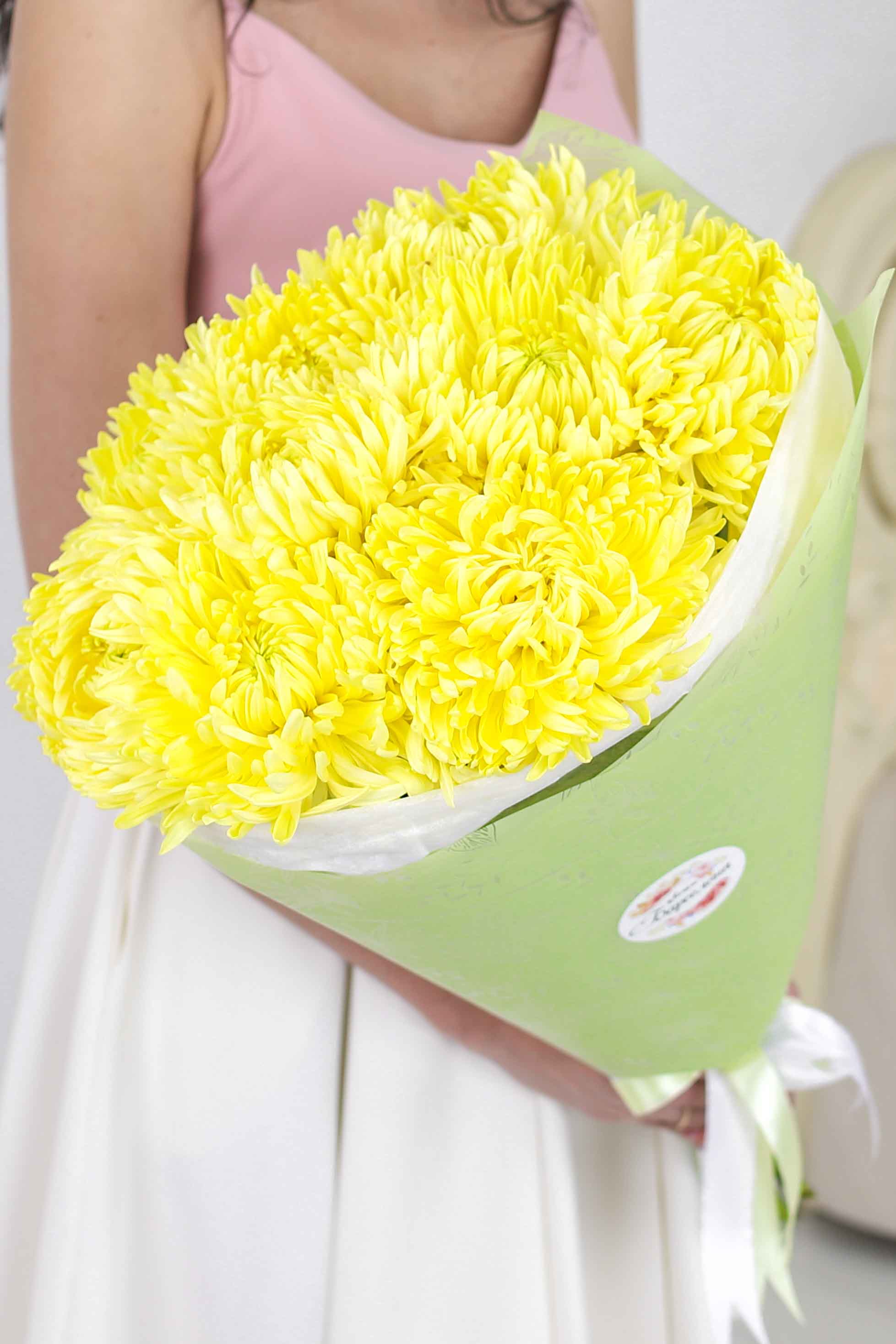 Состав-9 одноголовых хризантем Магнум, Высота-60 см., Упаковка-авторская, Подложка-тишью, Лента-широкая атласная.