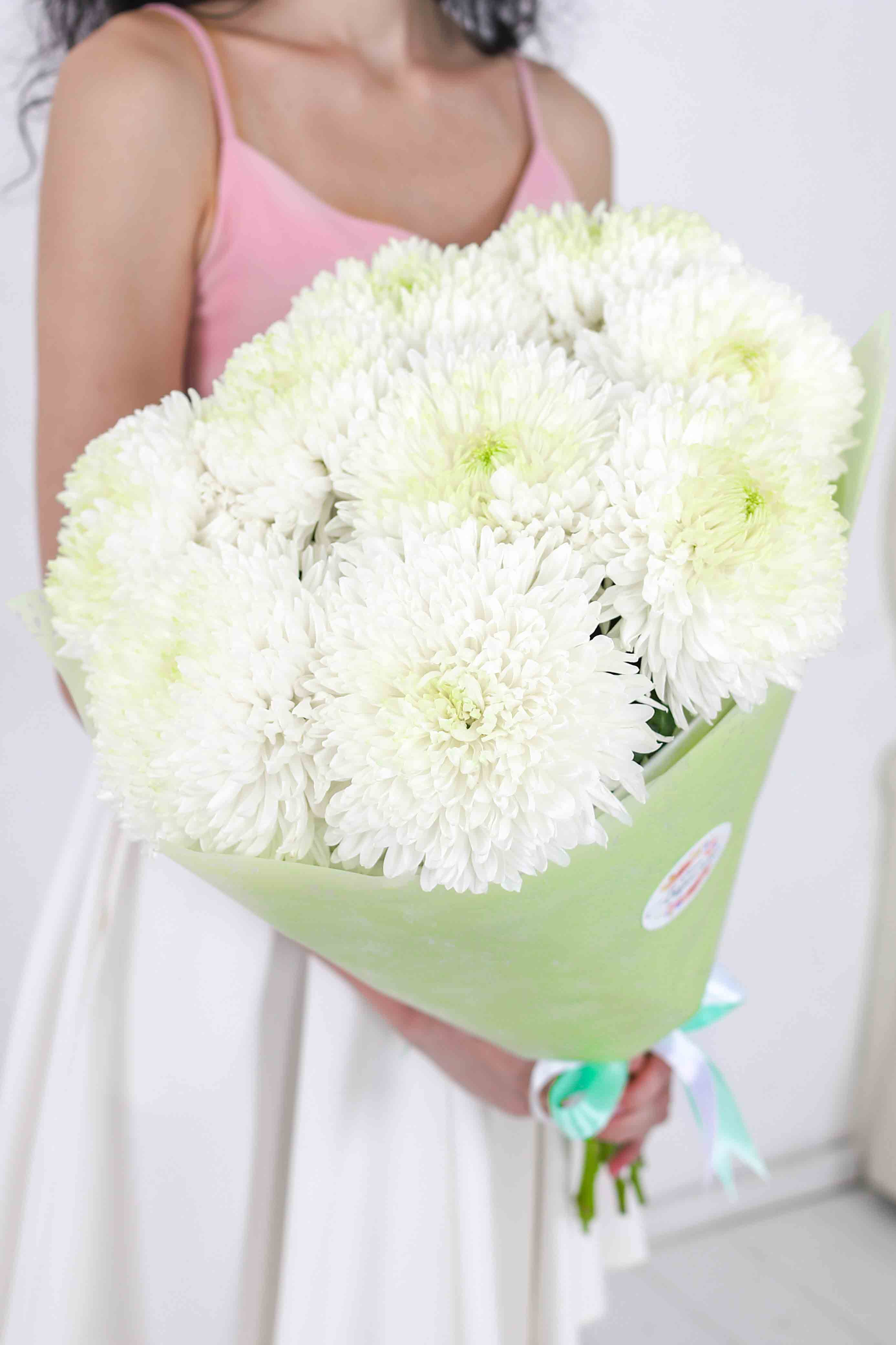 Состав-9 одноголовых хризантем Магнум, Высота-60 см., Упаковка-авторская, Подложка-тишью, Лента-широкая атласная.