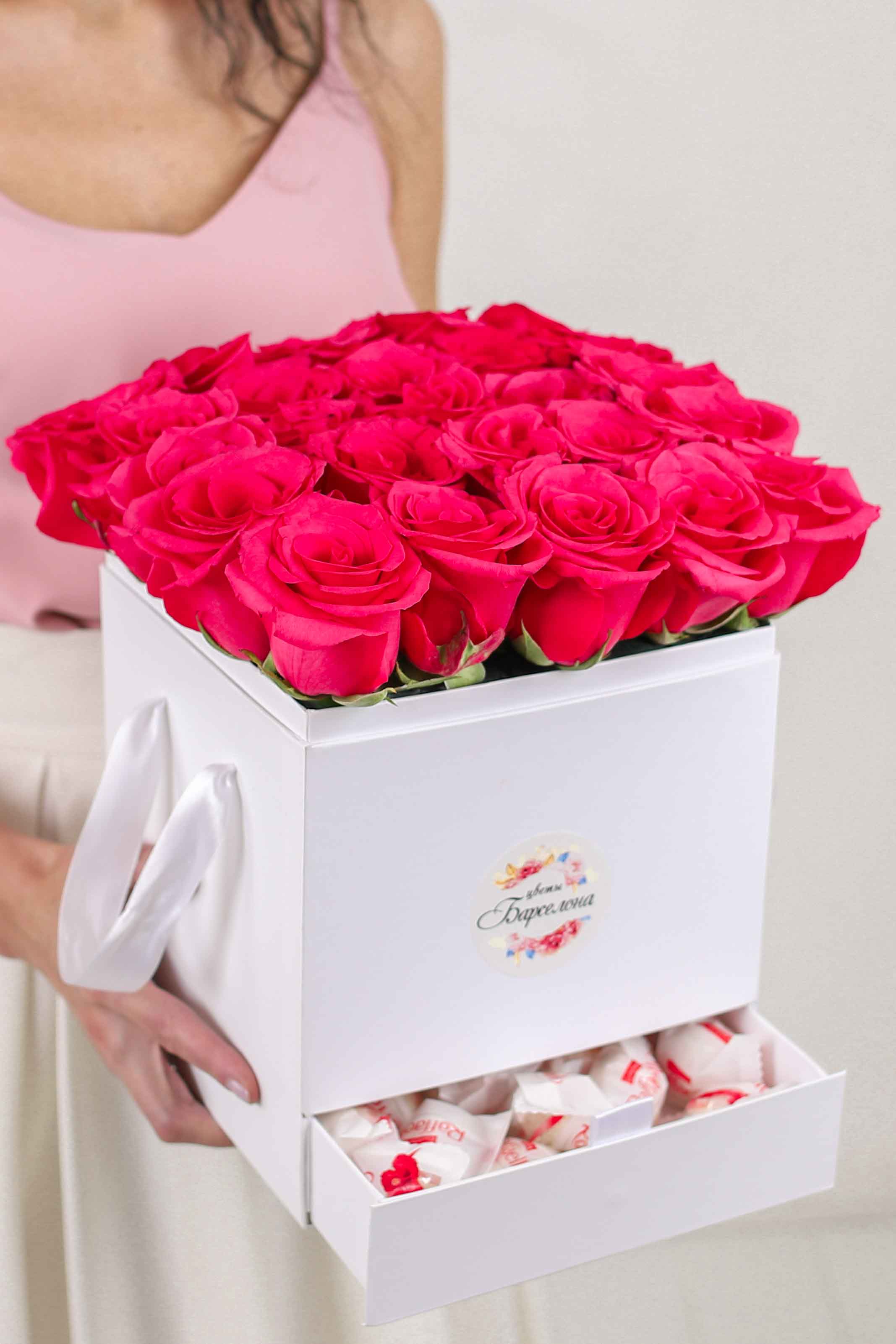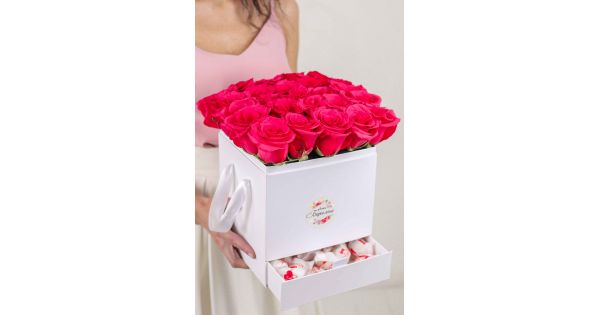 Страна-Эквадор, коробка белая, высота букета 50-55 см., внутри коробки-вода, подложка-тишью белая, широкая лента в цвет.