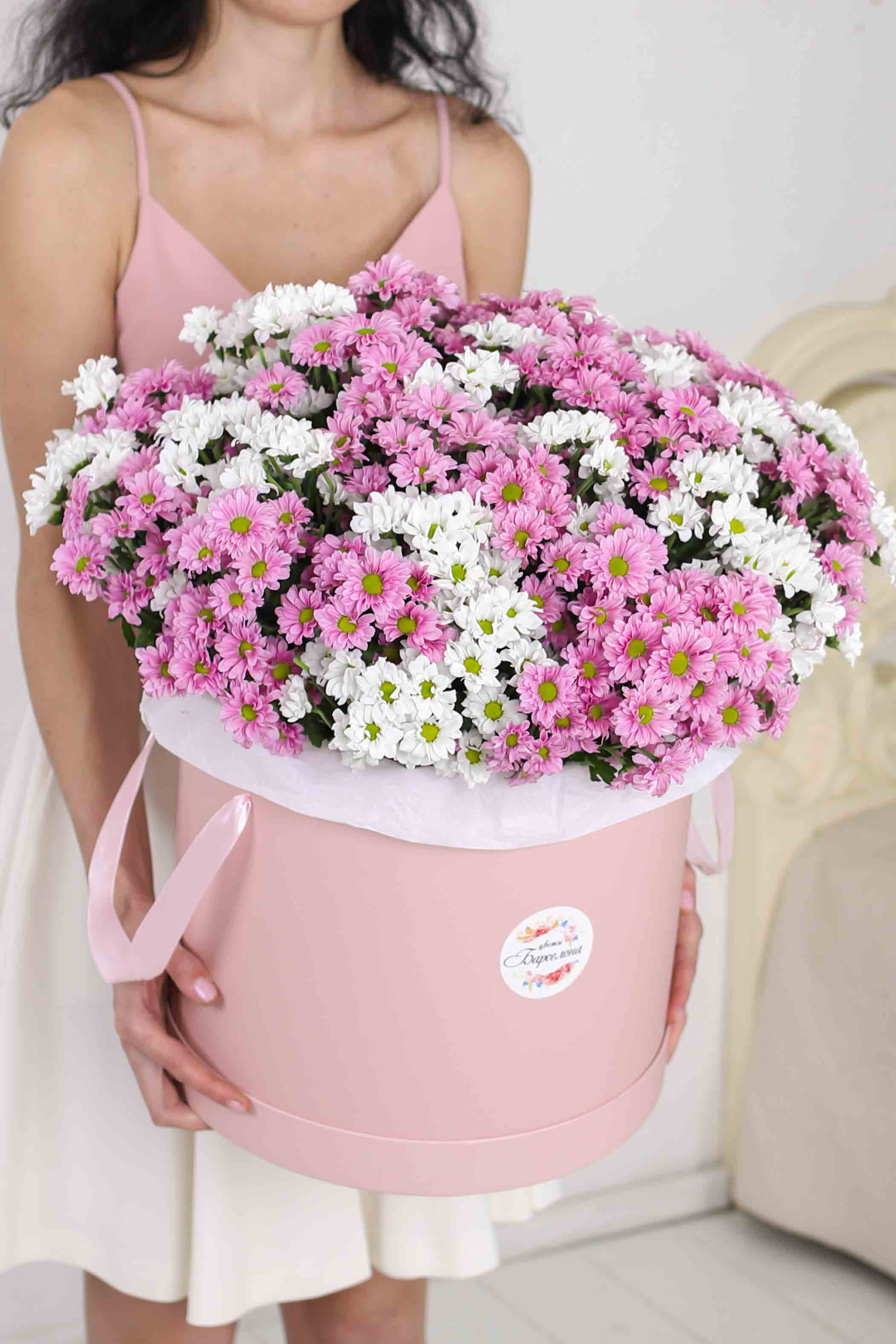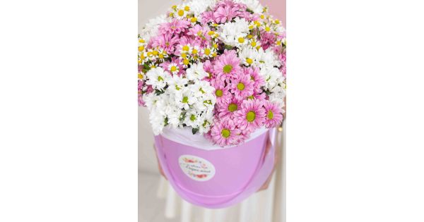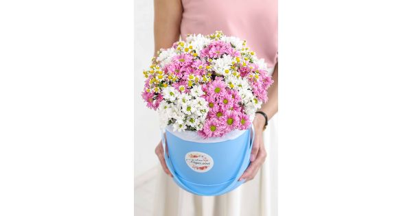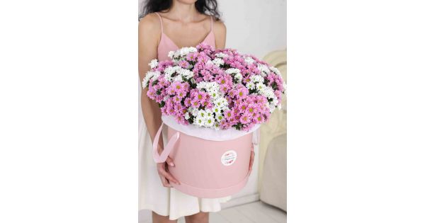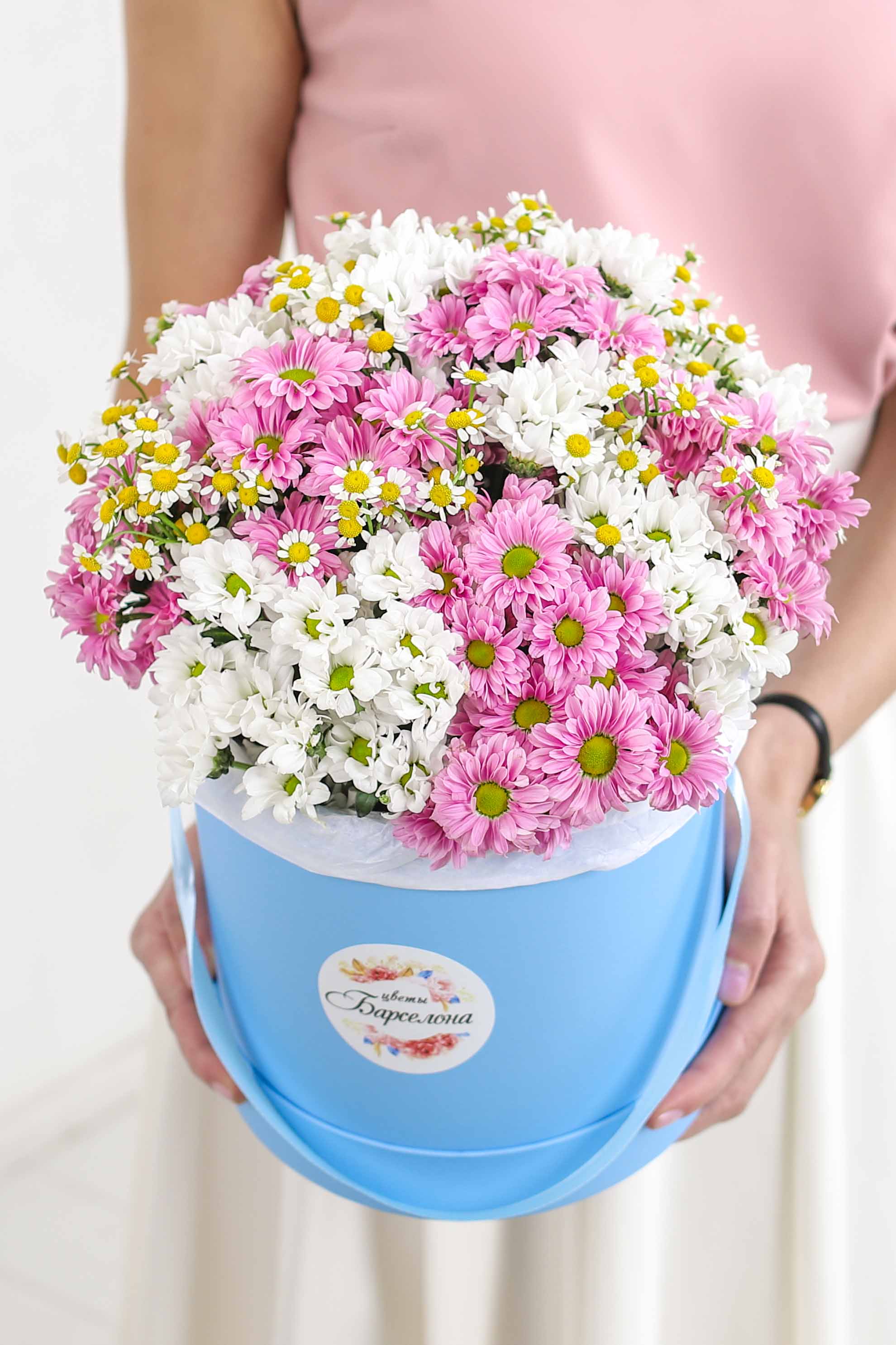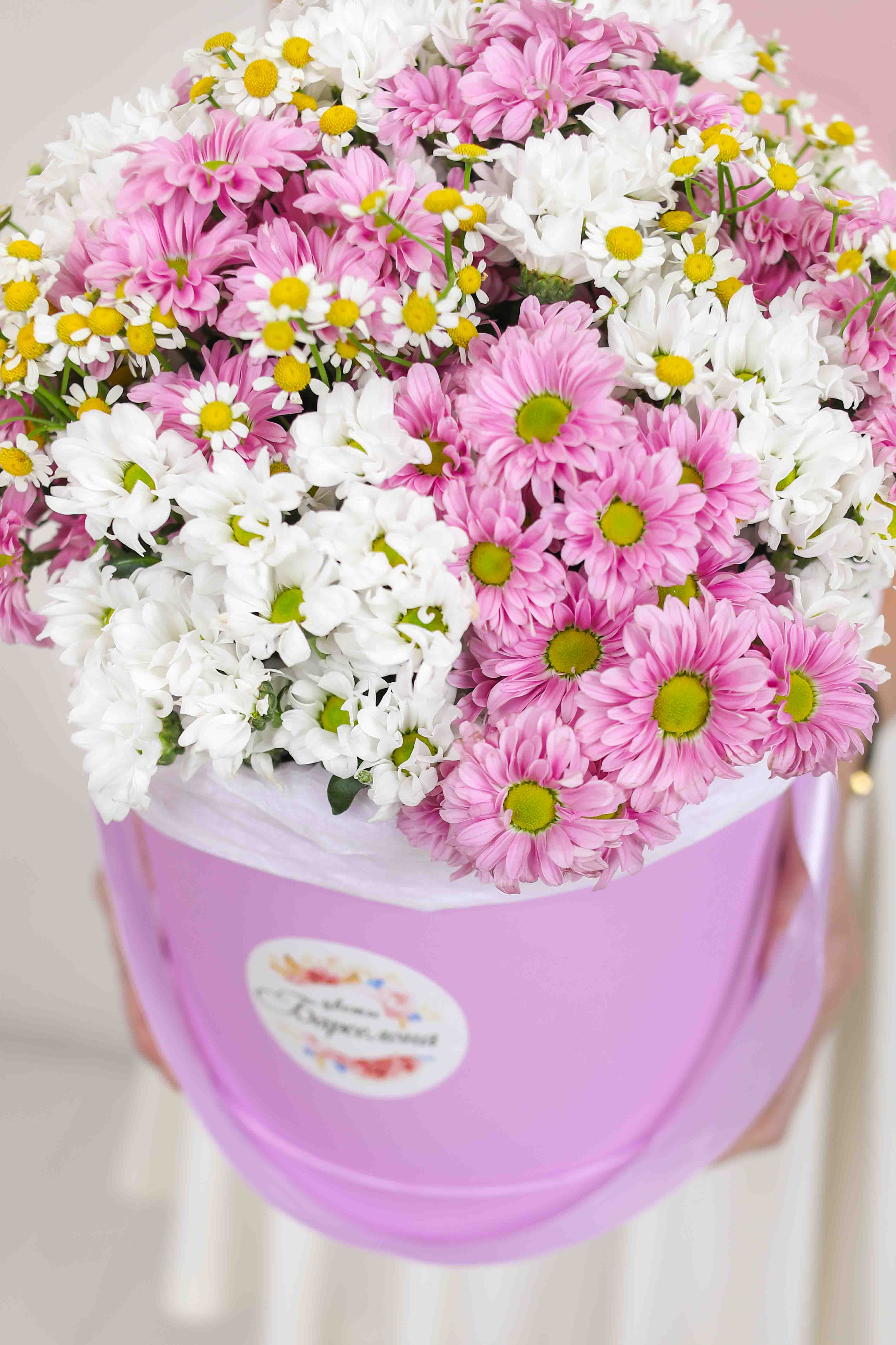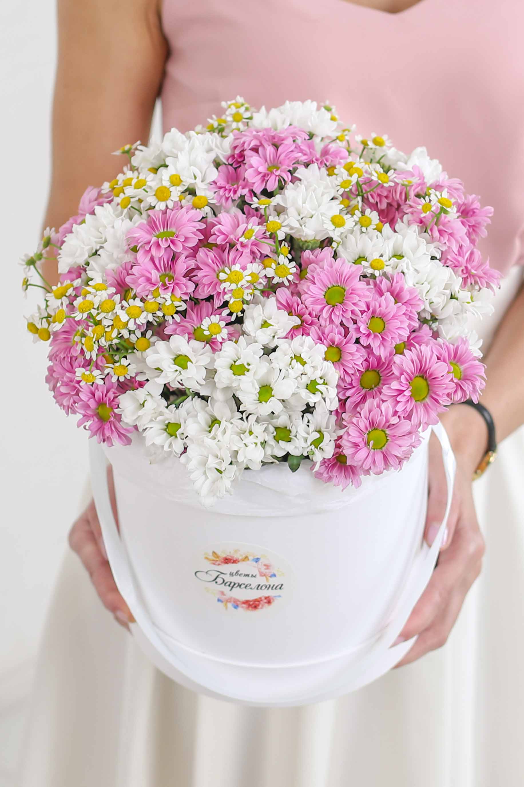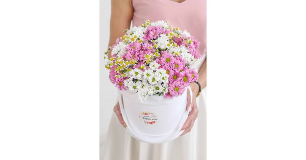Ромашка кустовая (матрикария)-6 шт., Хризантема Сантини микс-15 шт., коробка-высота 35 см., подложка-тишью белая, атласная лента.